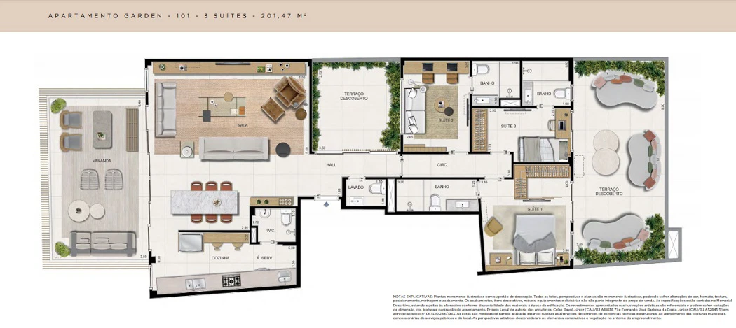 Apartamento Garden 3 suítes com 201m².